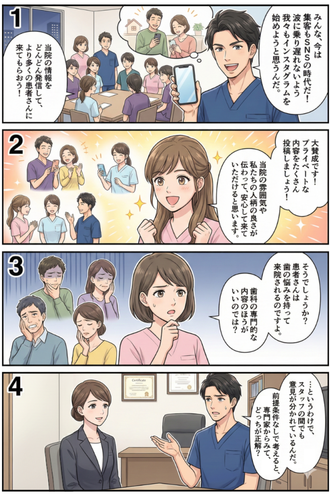 「インスタグラムの投稿は、プライベートな内容中心か、歯科の専門的な内容中心か?」。専門家が秒で答えた回答から見えてきた論点は、主に次の3点が挙げられそうです。