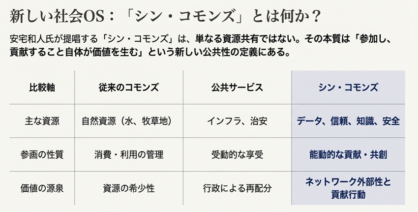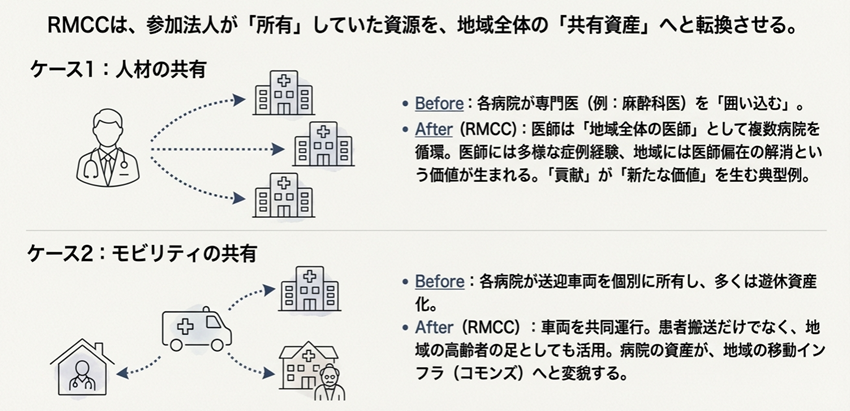 A1:単に資源を共有する仕組みにとどまらず、各法人が「自由意志で参画」し、地域貢献という目的のために連携すること自体が新しい価値を生む「新しい公共財(シン・コモンズ)」としての性質を持っているためです。
