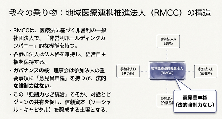 この地域医療連携推進法人の構造をもう少し整理すると、非営利ホールディングカンパニー的な構造を持ち、各参加法人は法人格を維持したまま経営の自主権を保持していることがわかります。地域医療連携推進法人の理事会は、参加法人に対する意見具申権はありますが、法的な強制力はなく、そのため各参加法人は、まさに“自由意志での参画”となります。